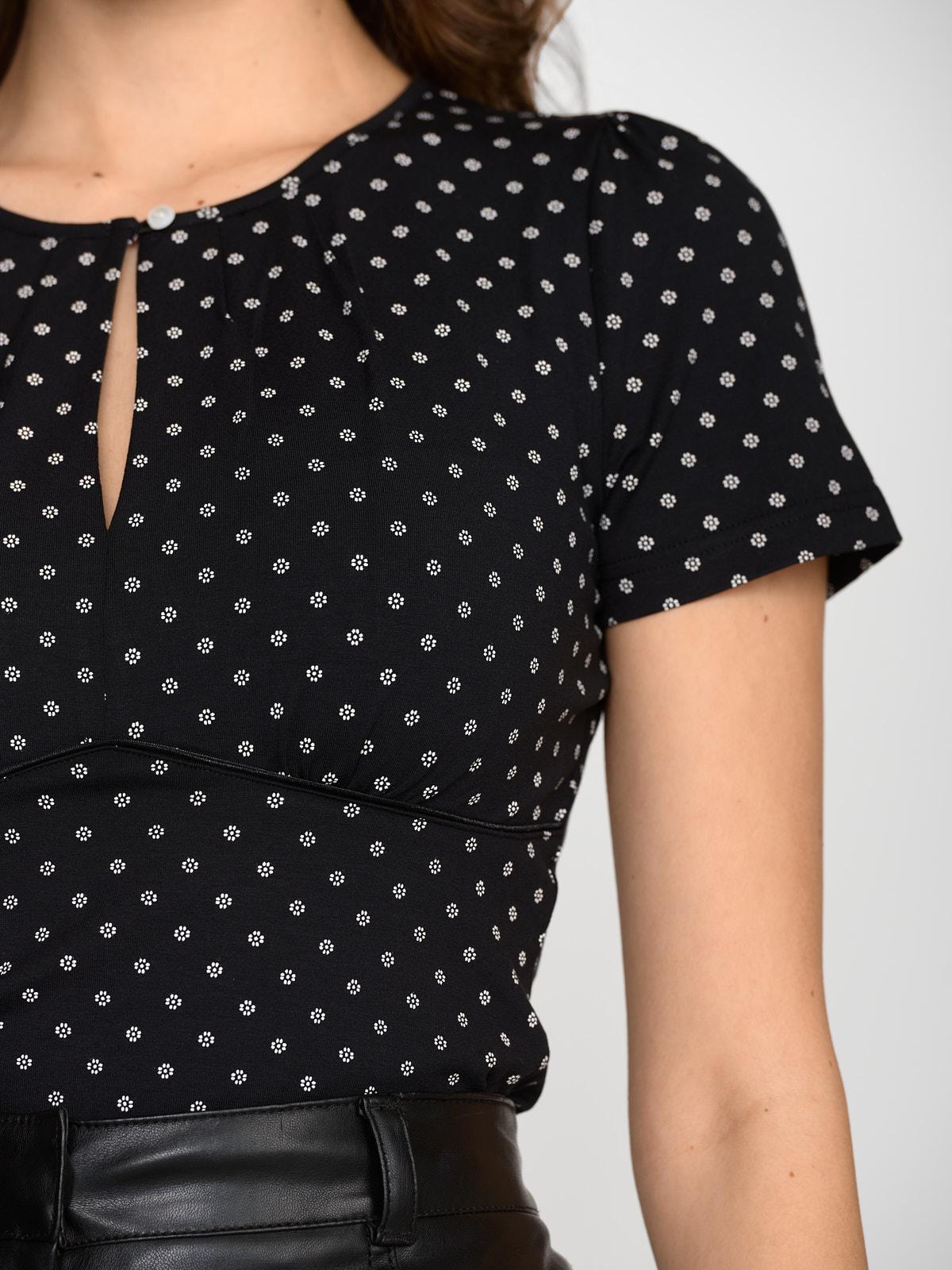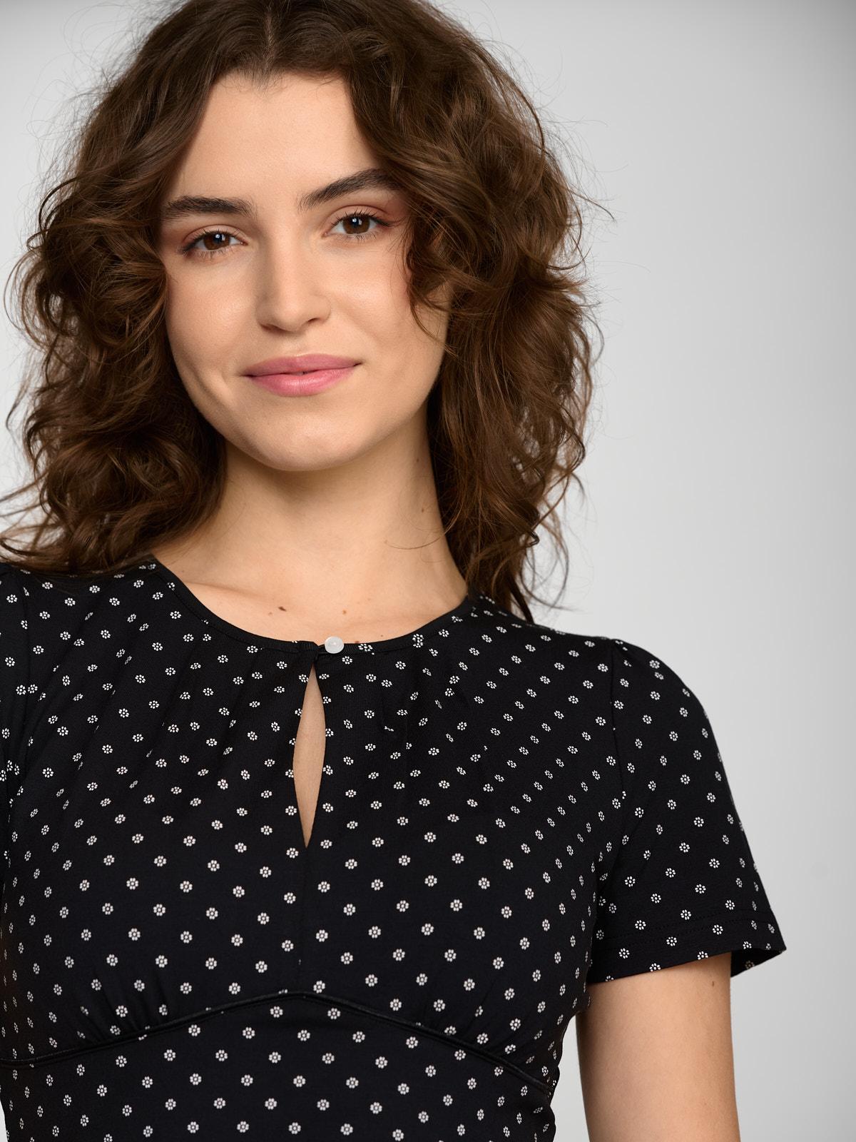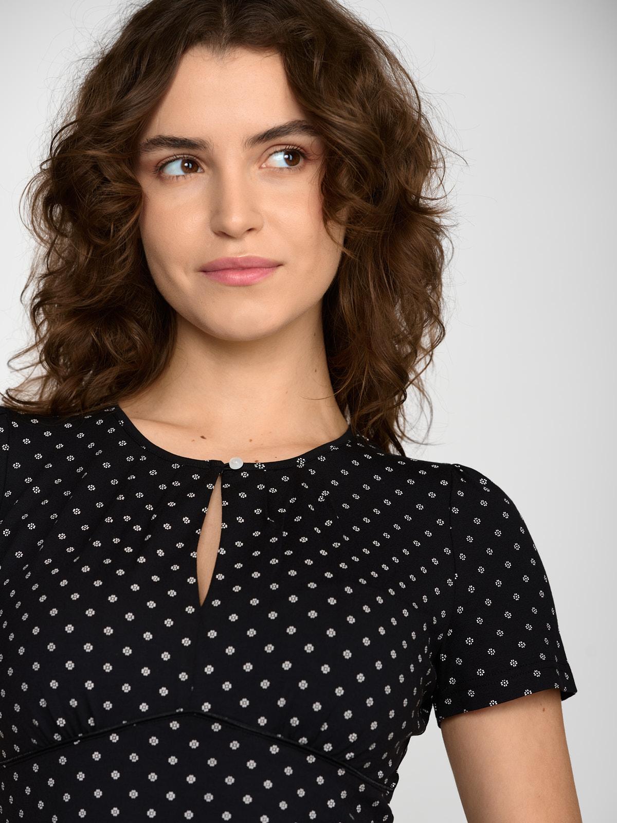 Stilvoll in den Sommer mit dem Vintage Emelie Shirt von Vive Maria Das süße Vive Maria Shirt ist aus einem angenehmen Viskosematerial mit Elasthananteil. Es ist figurbetont geschnitten und hat kurze Arme, die mit einer schlichten Naht abgeschlossen werden. Der runde Halsausschnitt ist mit einem Einfassband in Stofffarbe abgeschlossen und wird vorne mit einem kleinen Knopf und einer Gummischlaufe geschlossen, so dass ein schmales Guckloch entsteht. Eine Knopfleiste ziert den Dekolleteebereich. Eine eingezogene Gummipaspel dient als Unterbrustnaht und sorgt für einen guten Sitz. Den schwarzen Stoff zieren minimalisstische helle Blüten. Das 'Vintage Emelie' Shirt von Vive Maria überzeugt mit schlichter Eleganz und passt sowohl zur Jeans als auch zum Hosenanzug. Länge in Gr. S ca. 58 cm