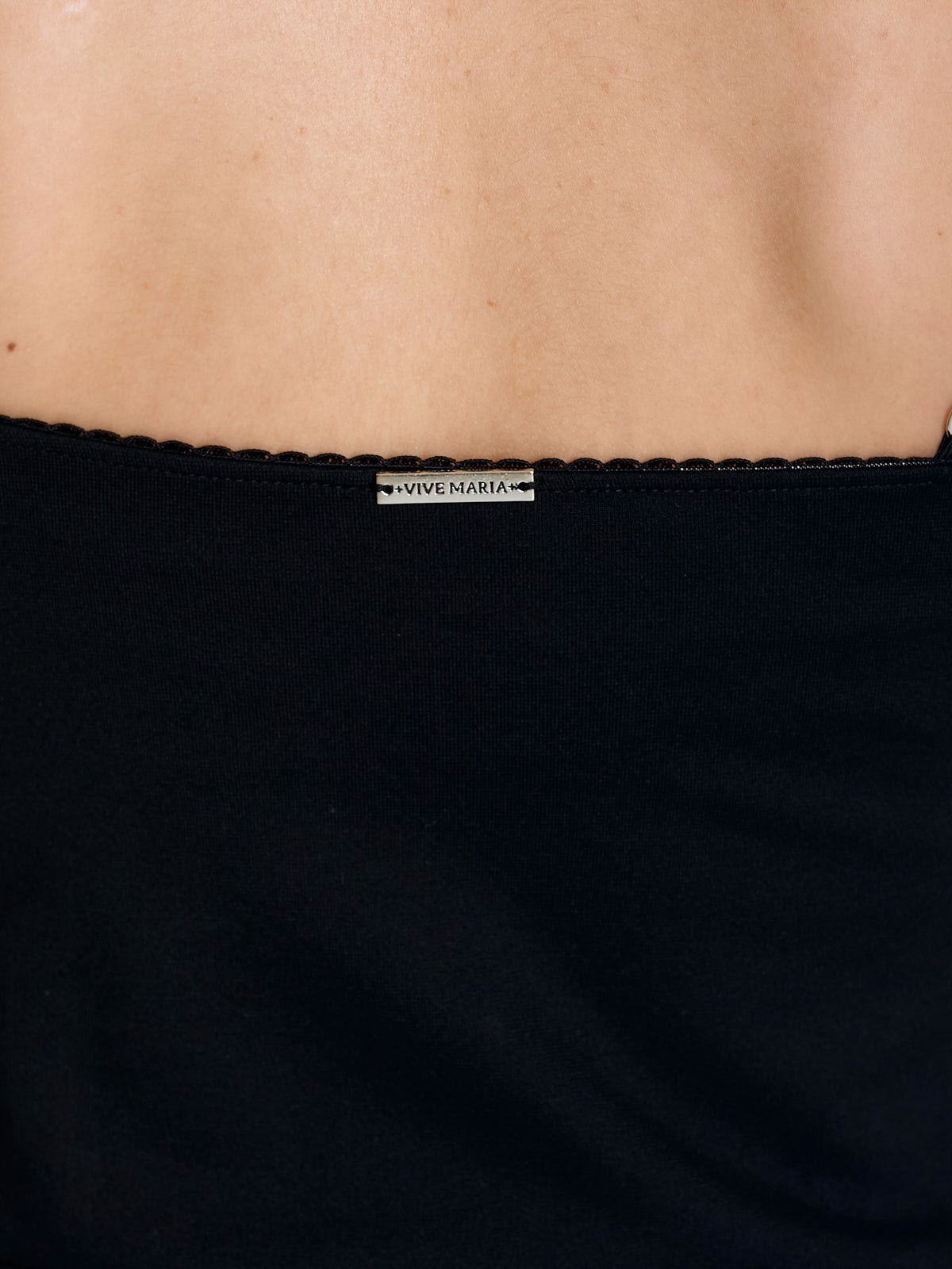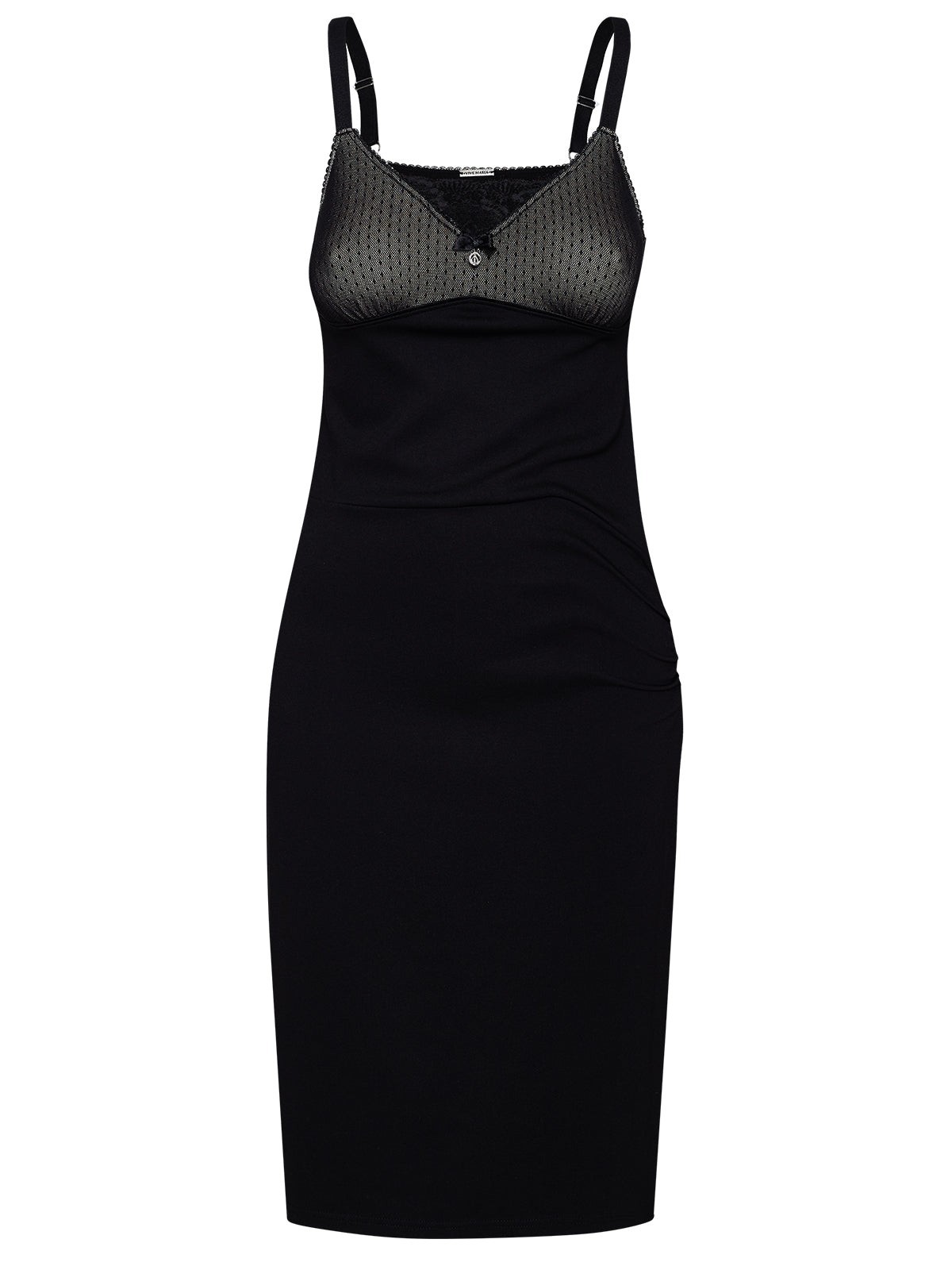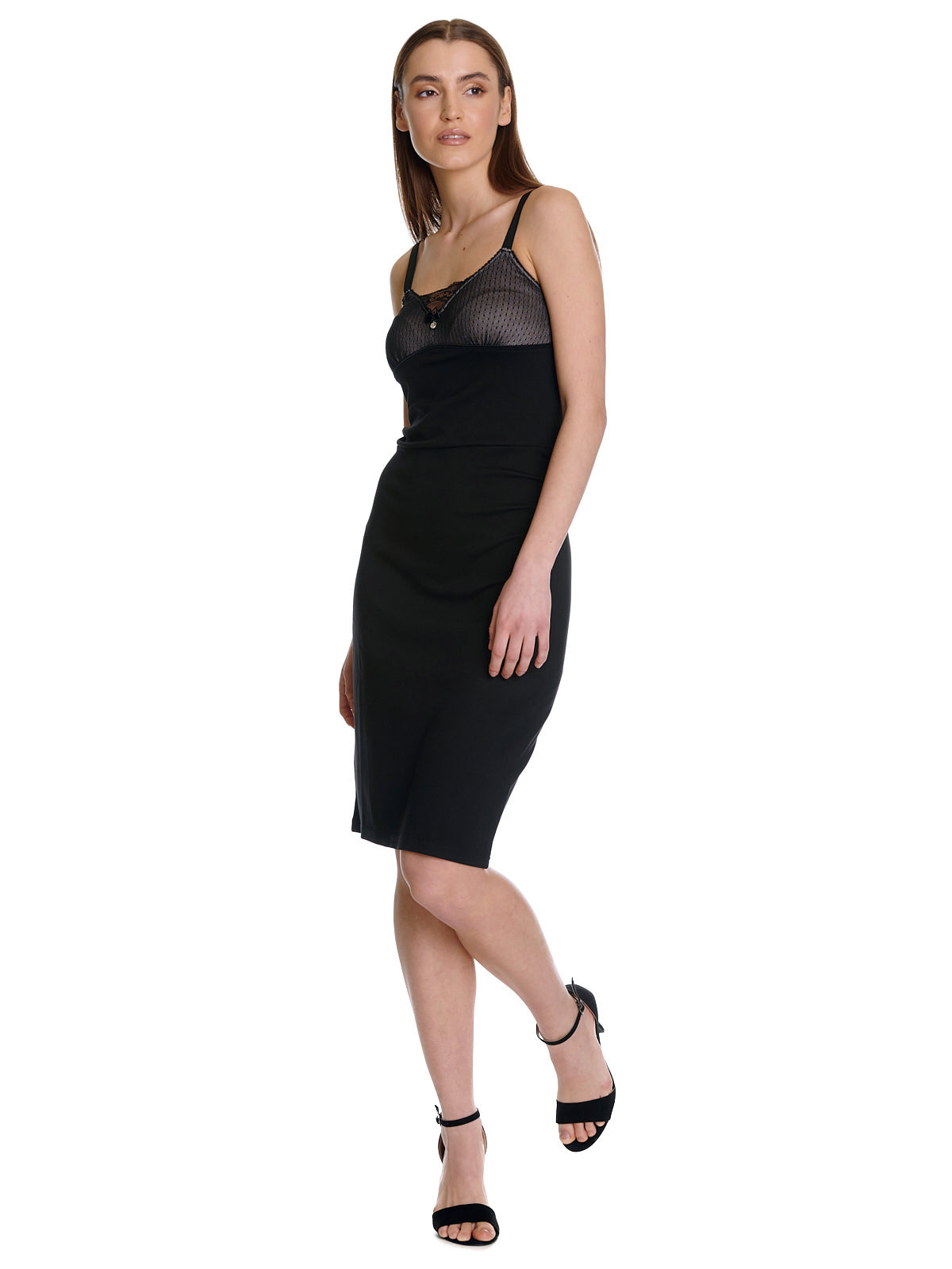 Einsatz: 97% Polyester, 3% ElasthanDas Vive Maria Kleid ist aus einem angenehmen Viskose-Polyamide-Elasthan-Gemisch, der Tüll ist aus einem Polyesterstoff mit Elasthan, unifarben schwarz - figurbetontes Etuikleid mit breiten verstellbaren Trägern - Brustbereich ist mit schwarzem Pünktchentüll überzogen - V-Ausschnitt mit transparenter Spitze, Satinschleife und Zick-Zack-Litze - gelegte Falten auf linker Seite kaschieren optisch Länge in Gr. S ohne Tröger ca. 80 cm